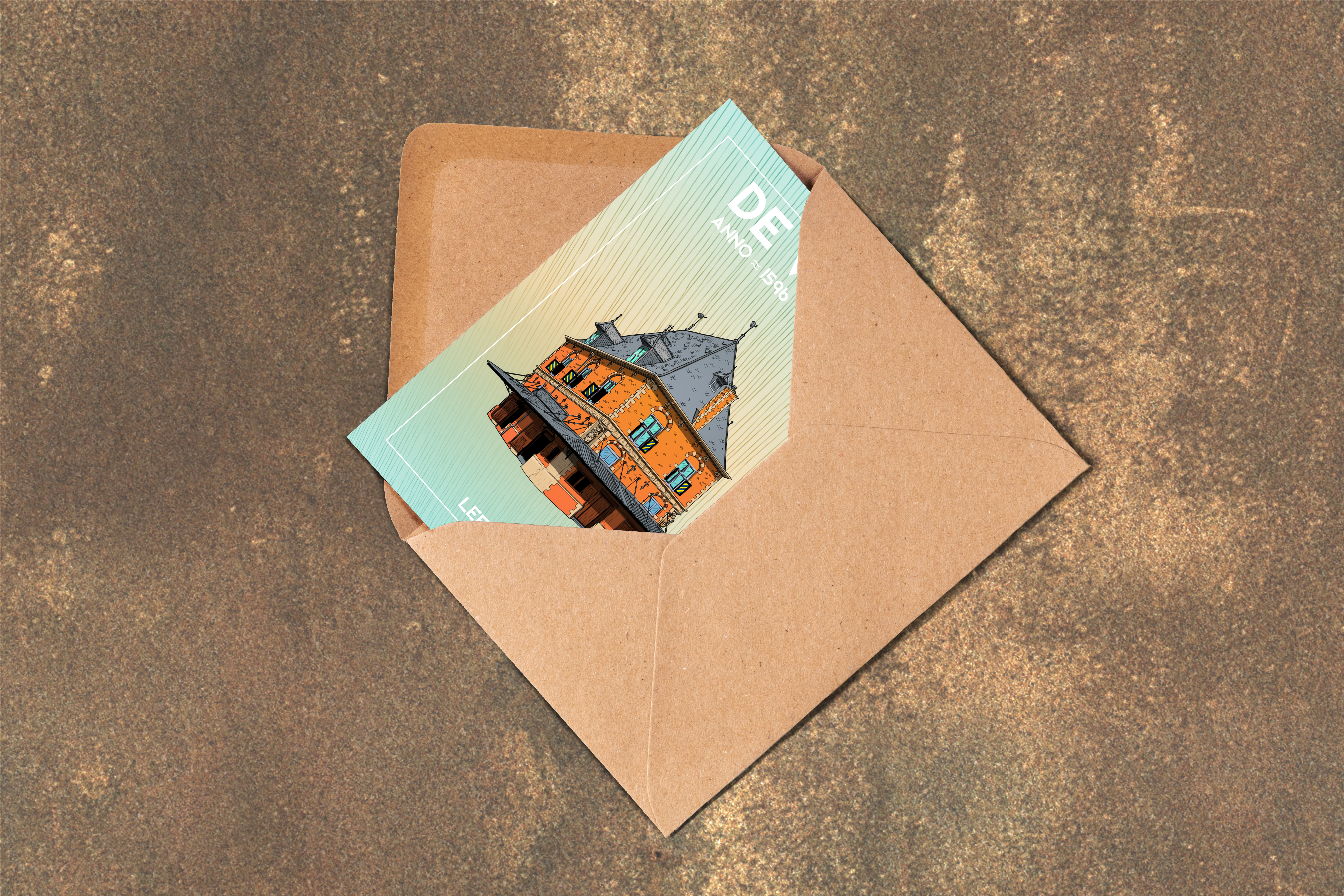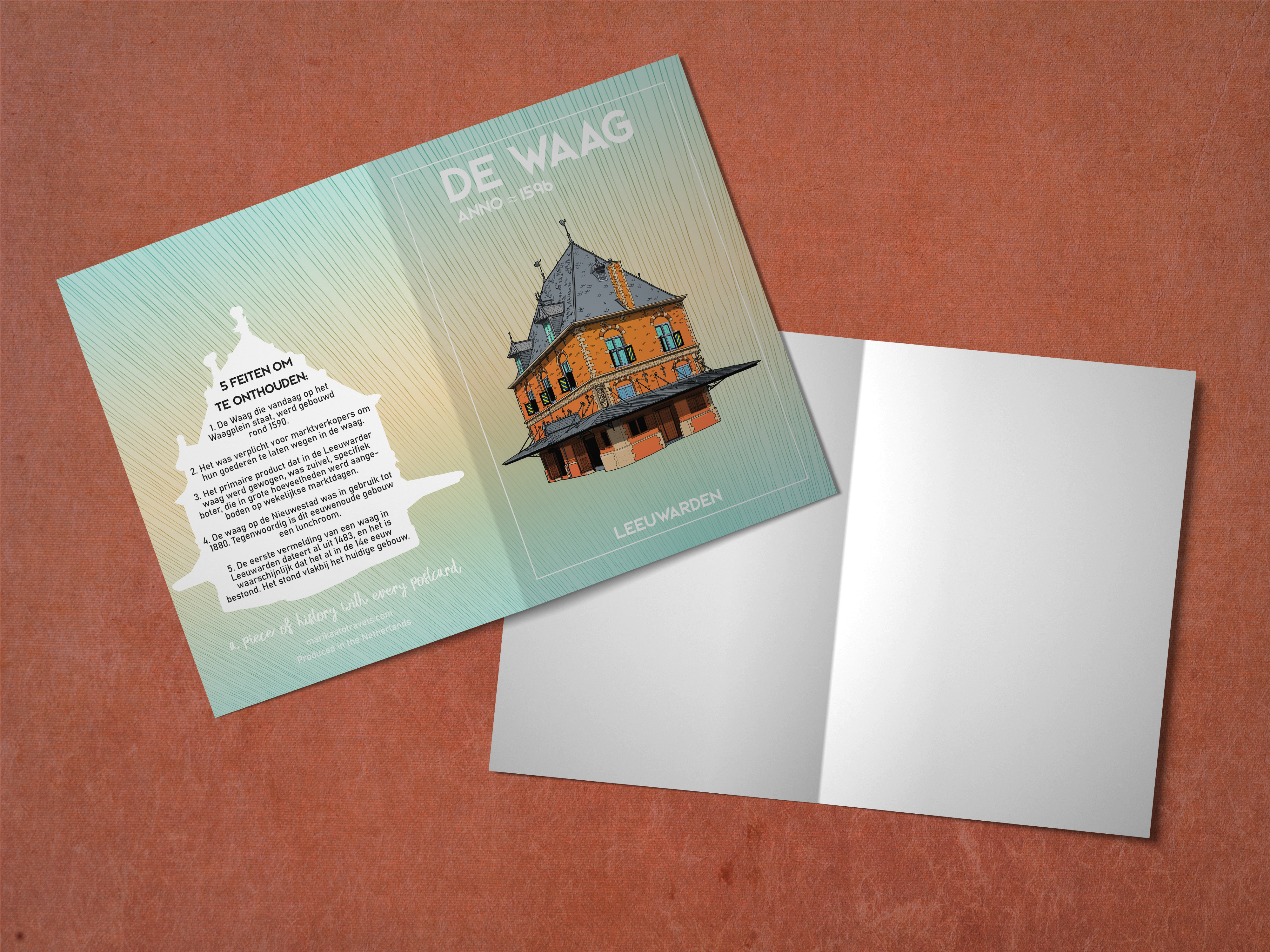 Fully colored A6 size (when folded) travel postcard of De Waag building in Leeuwarden, Friesland. The postcard features a detailed, hand-drawn illustration of De Waag building on one side and 5 historical facts about the building on the other. Available in different languages.