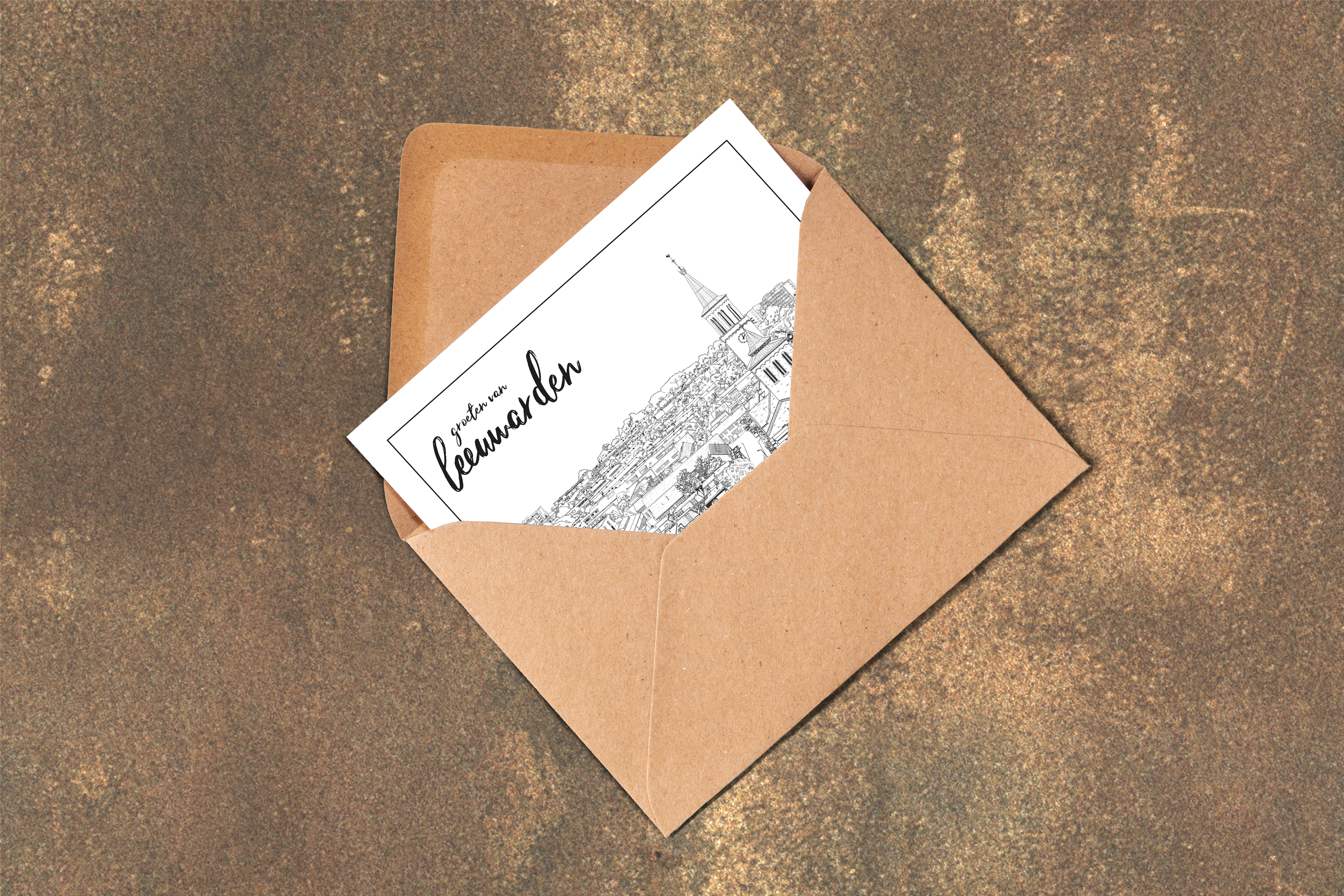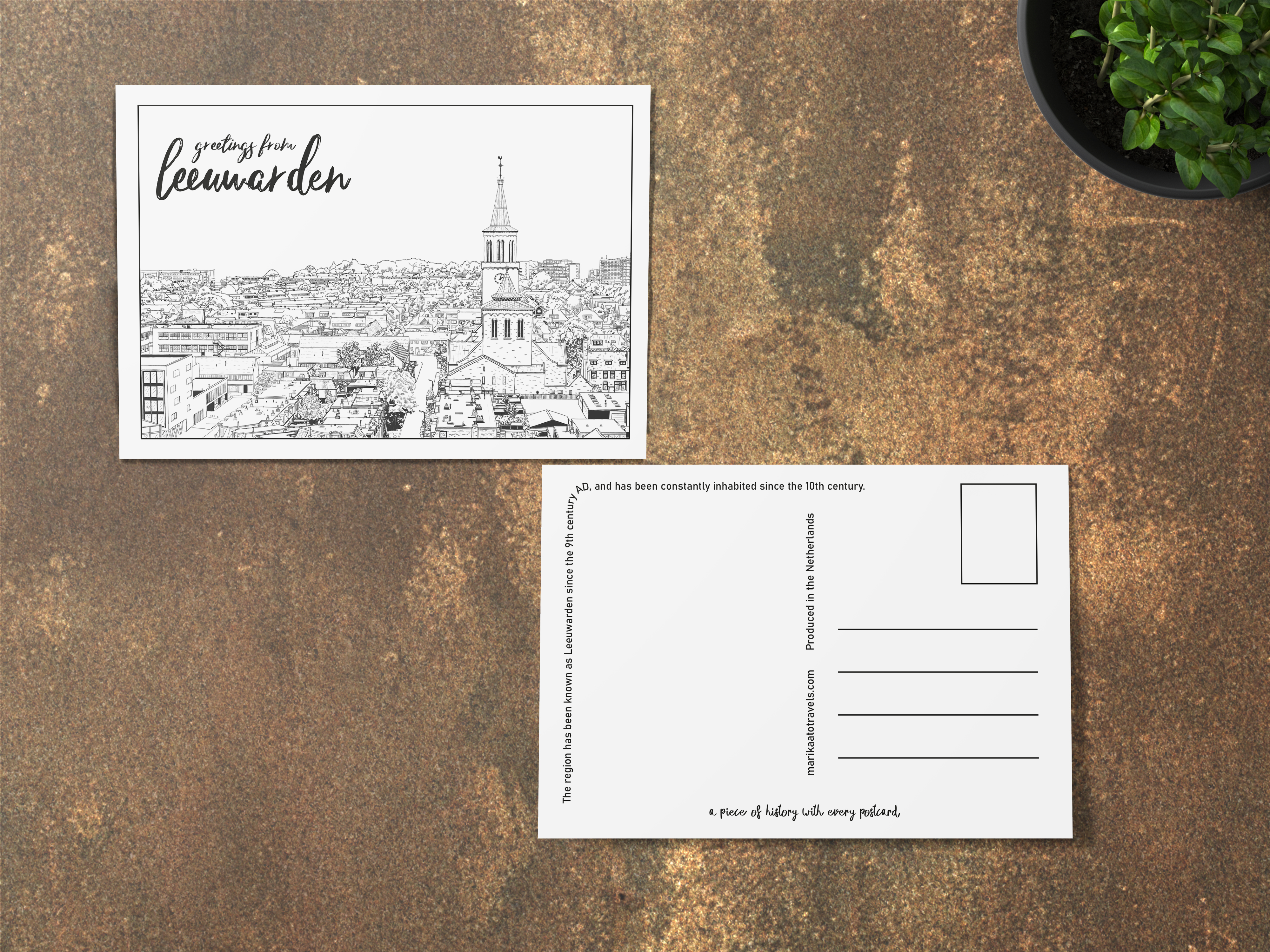 Black and white A6 size travel postcard of Leeuwarden city, Friesland. The postcard features a detailed, hand-drawn illustration of city landscape with the Saint Boniface Church on one side and a historical fact about the city on the other. Available in different languages.