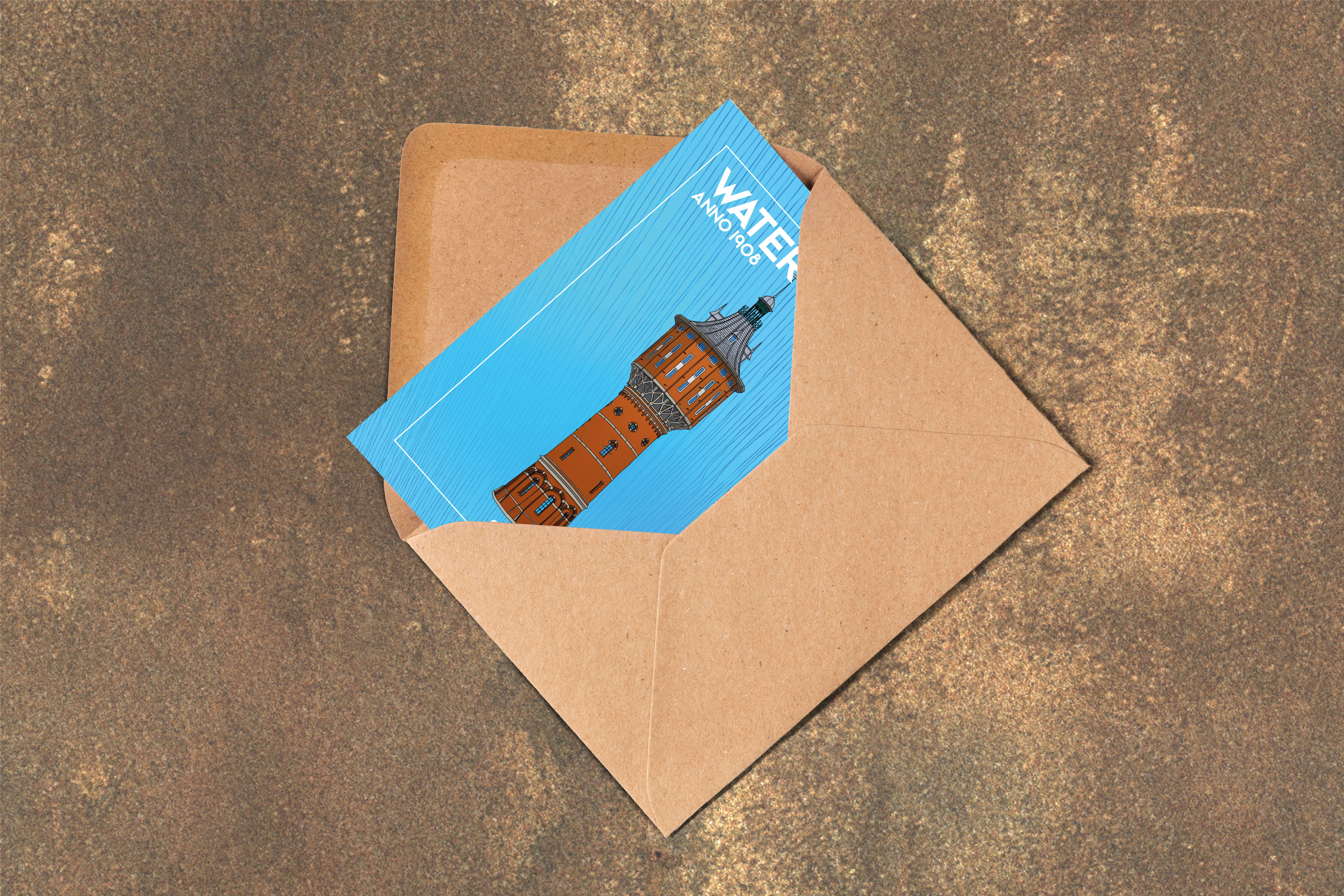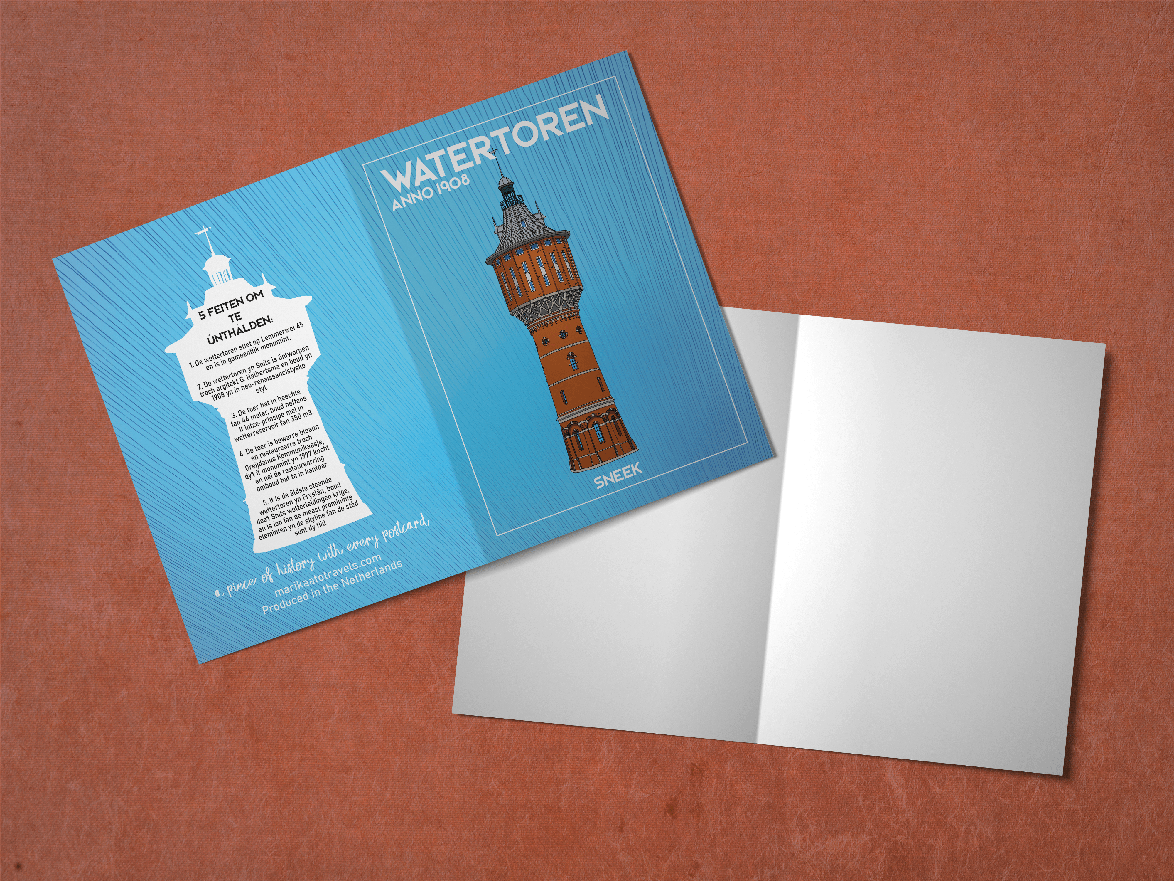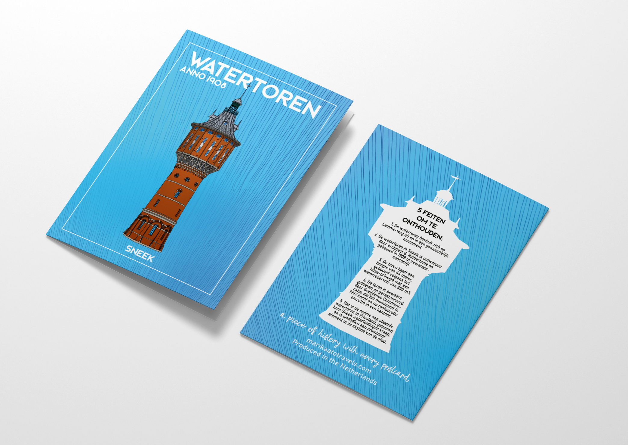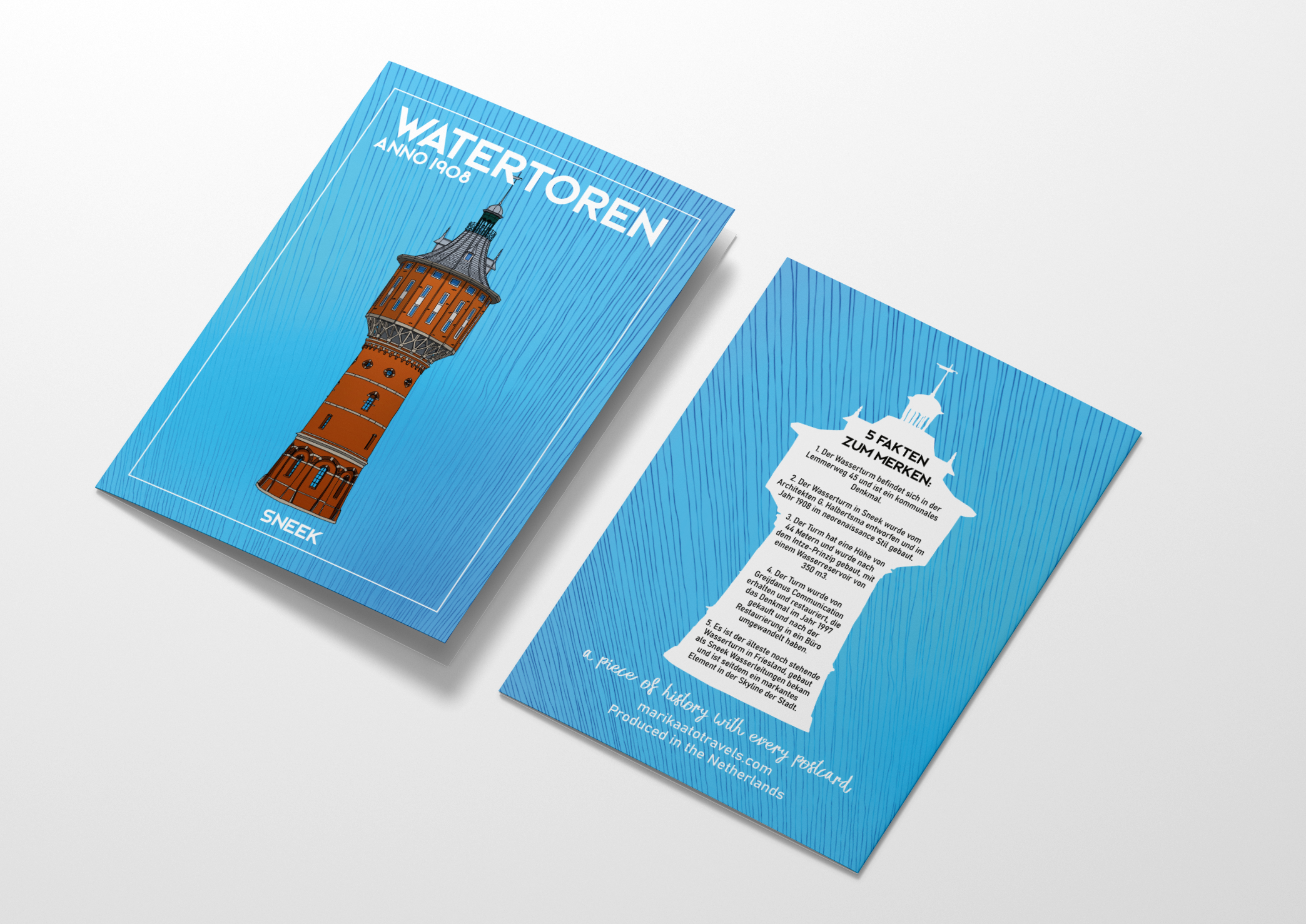 Fully colored A6 size (when folded) travel postcard of the Watertoren building, Sneek, Friesland. The postcard features a detailed, hand-drawn illustration of the Watertoren building on one side and 5 historical facts about the building on the other. Available in different languages.